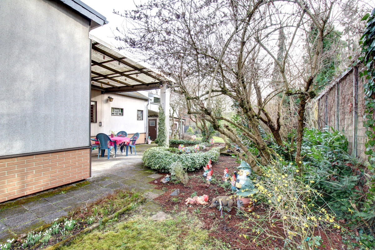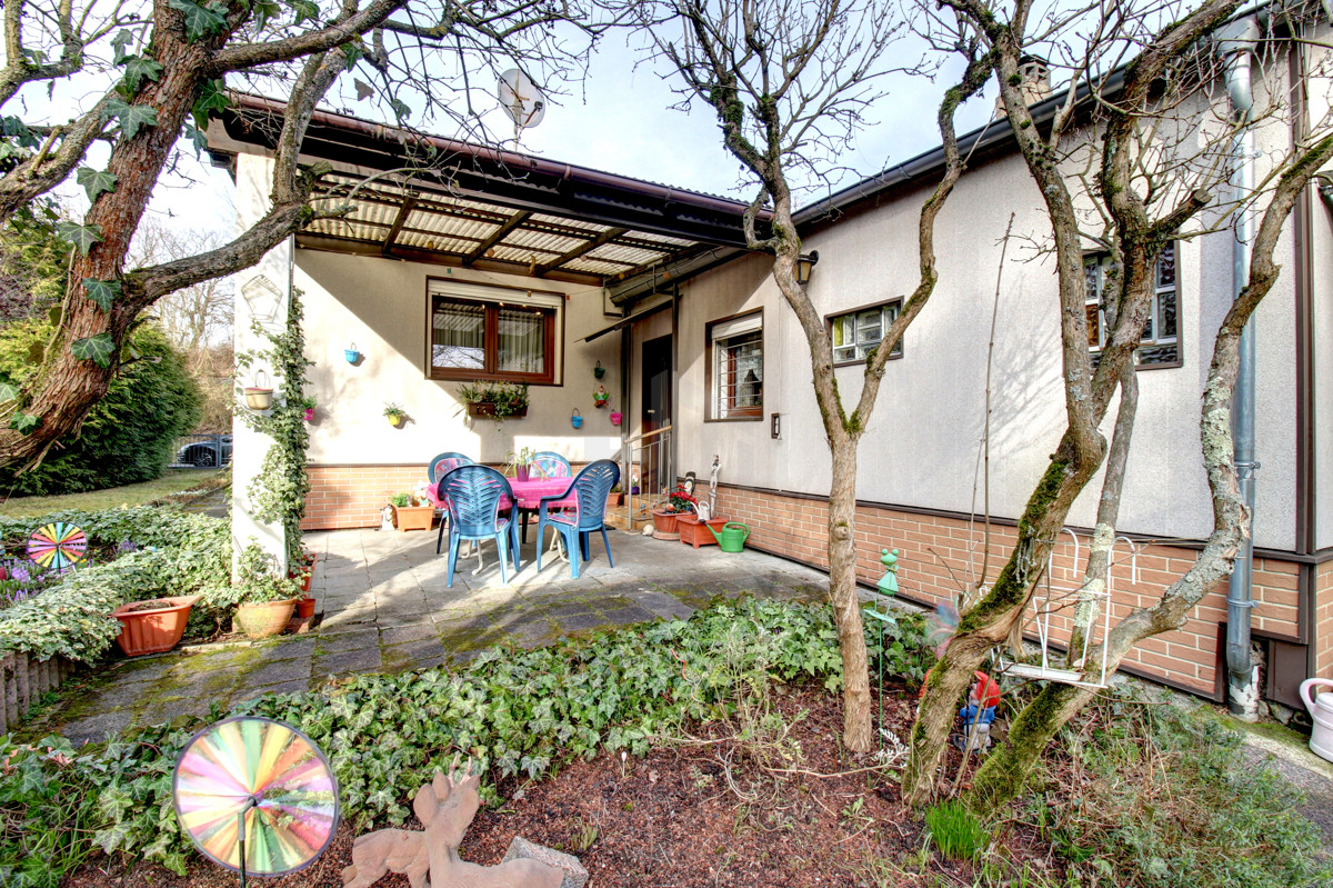 Der gemütliche Bungalow mit großem Garten und Blick ins Grüne steht auf einem Erbbaurechtsgrundstück der Stadt Frankfurt, in beliebter Wohnlage von Frankfurt-Griesheim.