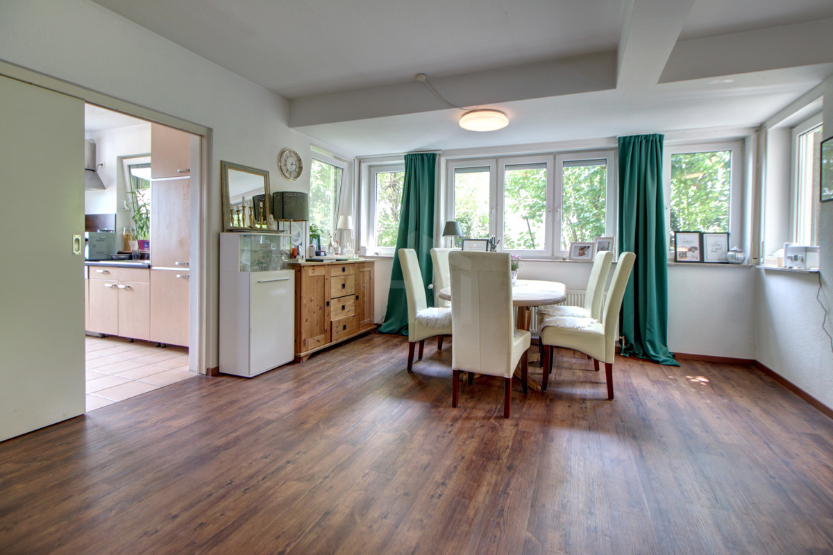 Das Herzstück des Hauses bilden das helle Wohnzimmer mit Terrasse, der prominente Essbereich im hellen und blickgeschützten Erker, zusammen mit der angrenzenden Küche: Hier wird gemeinsam gegessen, gelesen, diskutiert, gespielt oder der nächste Wochenendausflug geplant. Ein hochwertiger Kamin sorgt für wohlige Wärme und niedrige Heizkosten, auch an kühleren Tagen.