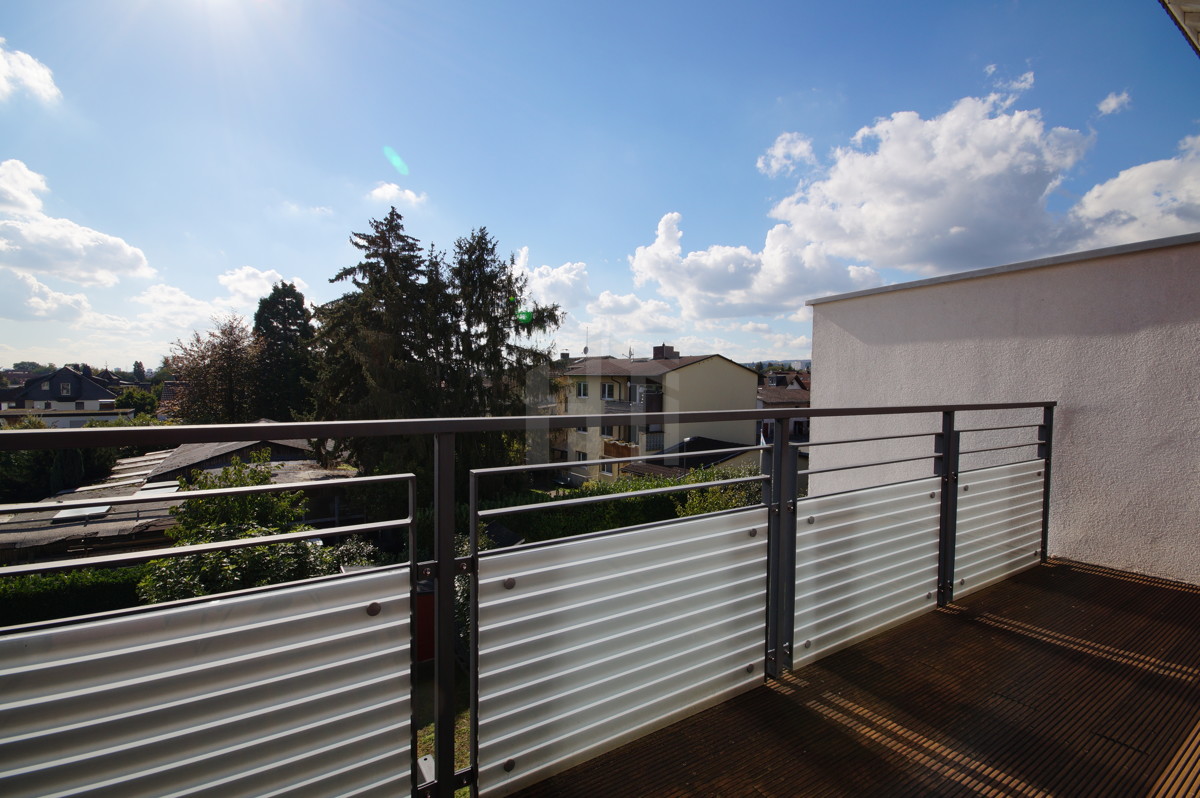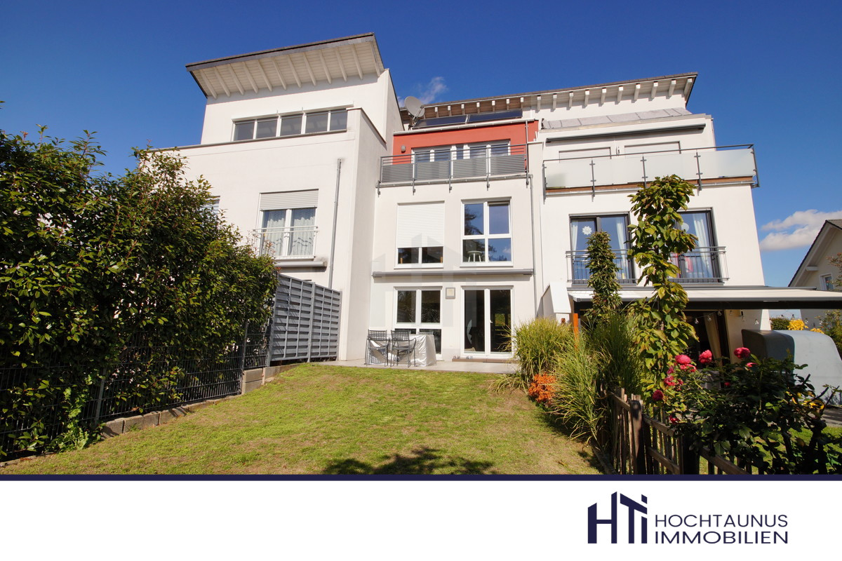 In dem sonnenverwöhntem Garten und der mit hochwertigem Bangkirai-Holz ausgelegten Dachterrasse genießen Sie die Sonne und einen herrlichen Blick zum Taunus und zur Frankfurter Skyline.
