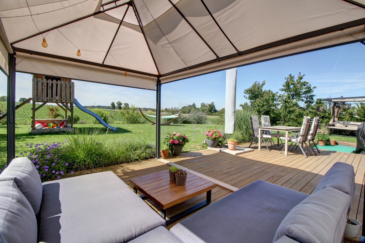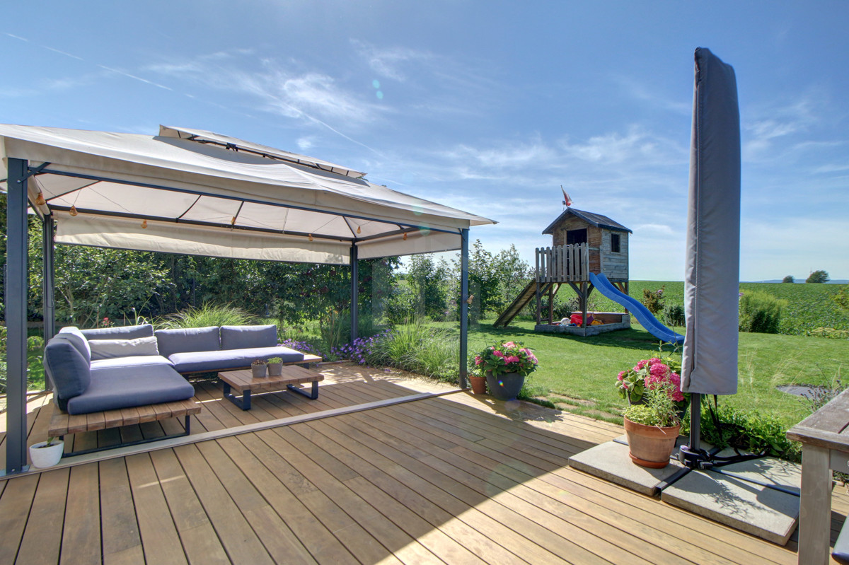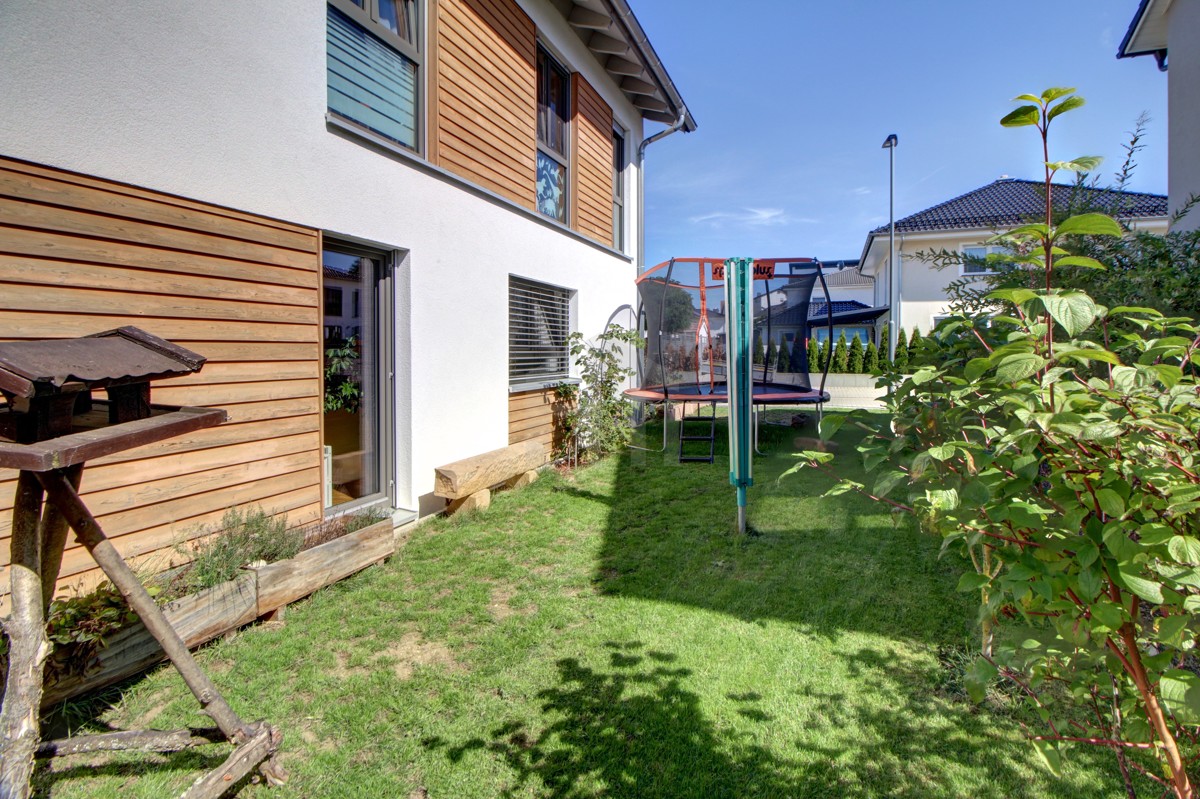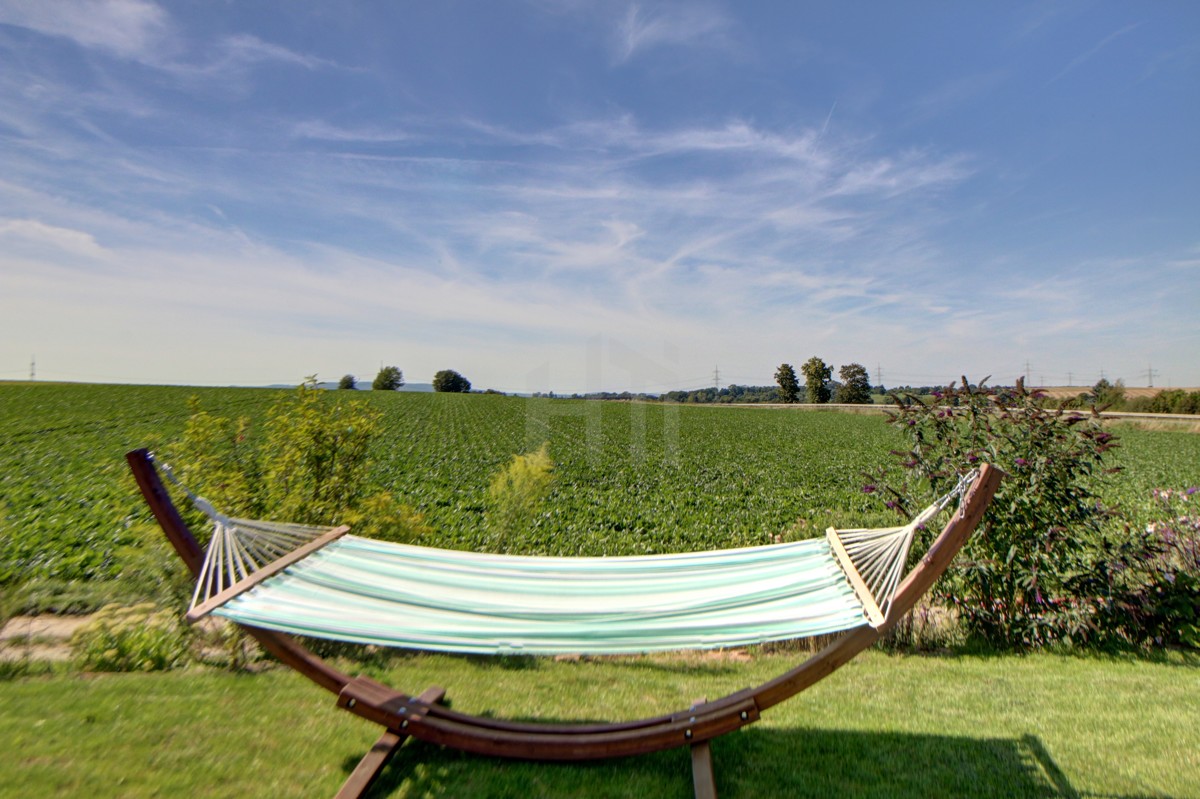 Der große Garten mit freiem Blick über die Felder lädt Kinder zum Spielen ein, für die Kleinsten z.B. in der Sandkiste unter dem Klettergerüst, während die sonnige Terrasse selbst zu später Stunde noch beste Gelegenheit für den entspannten Feierabend oder die chillige Grillfeier mit Freunden am Wochenende bietet.