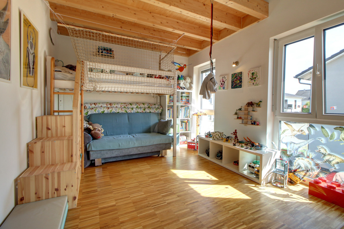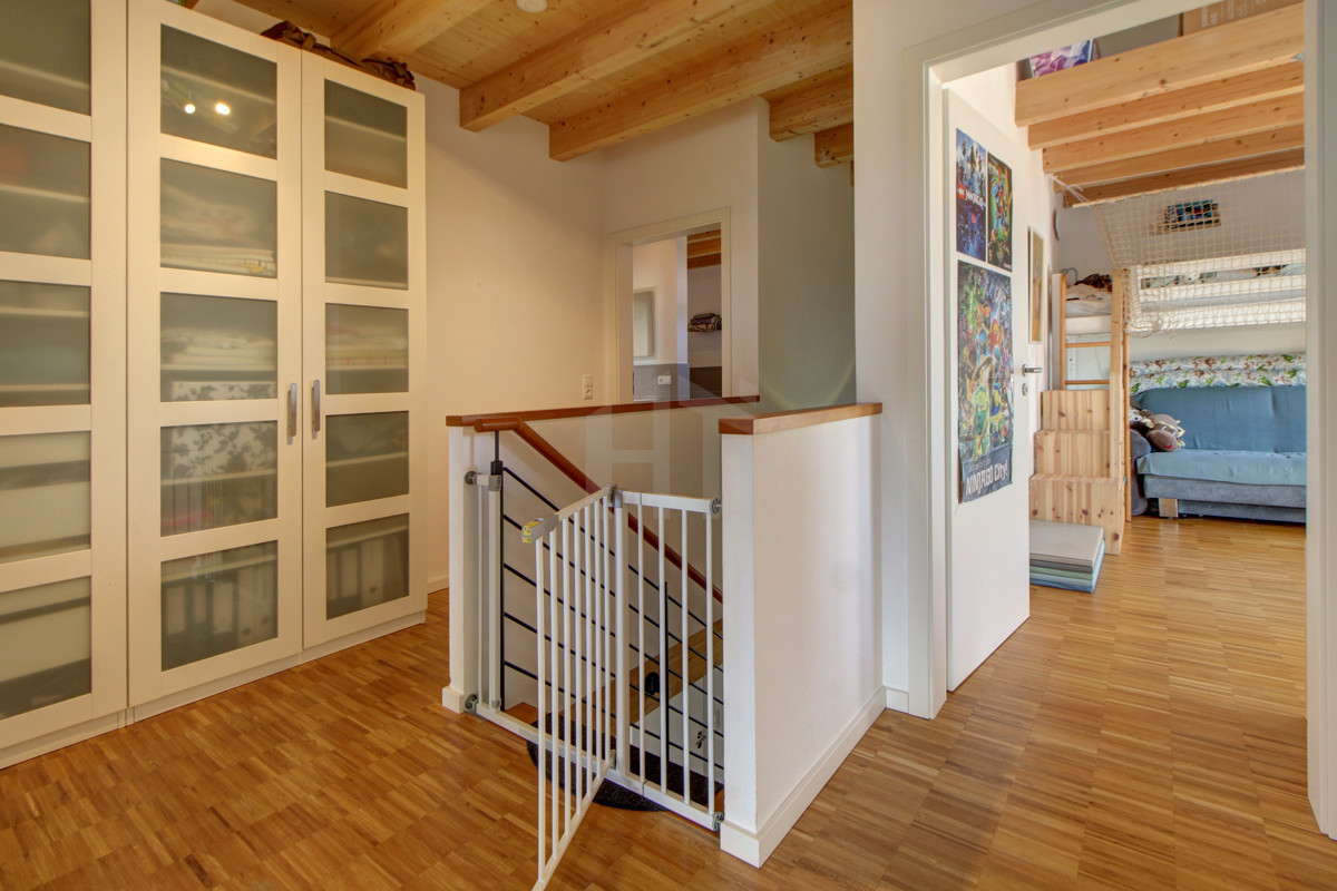 Die attraktiv geschnittene und repräsentative Immobilie bietet auf zwei Etagen jedem Familienmitglied genügend Platz und Entfaltungsmöglichkeiten: Das Obergeschoss eignet sich durch 2 Kinderzimmer, das ansprechenden Elternschlafzimmer mit Ankleide und direktem Zugang zum großen Tageslichtbad - mit Badewanne und Dusche - als privater Rückzugsort für die ganze Familie.