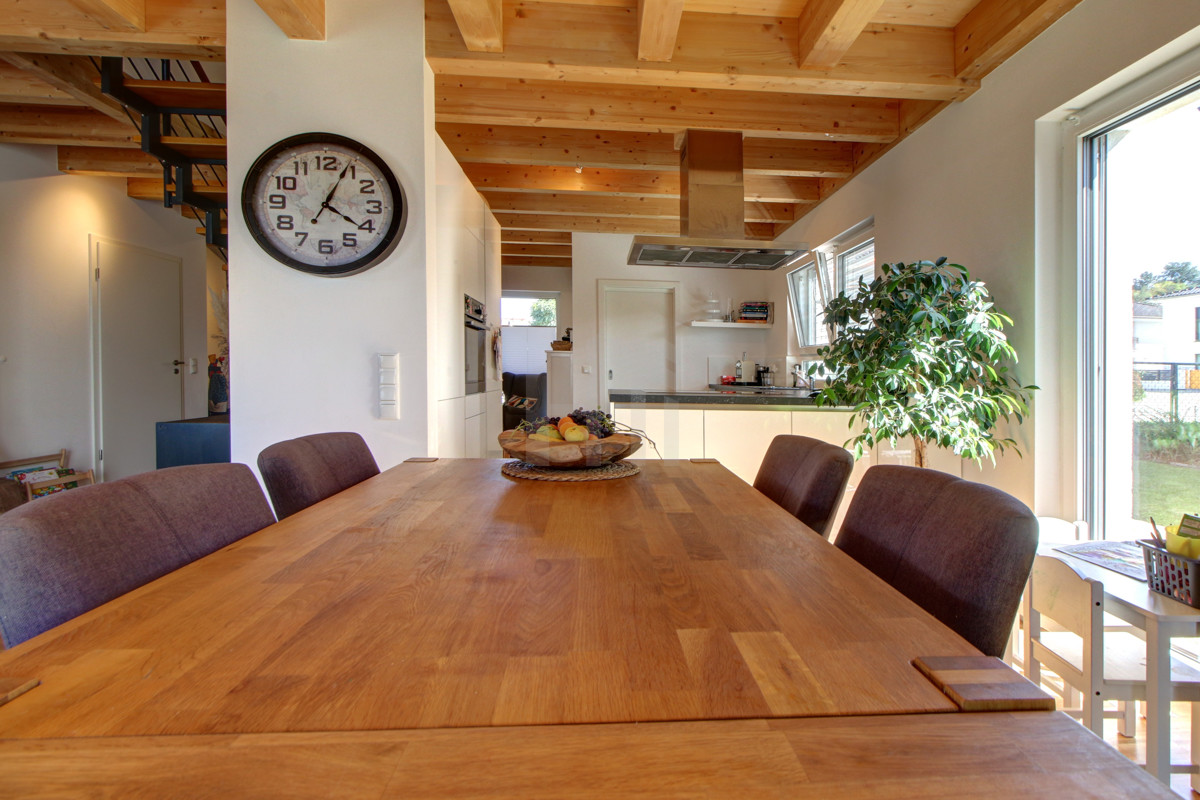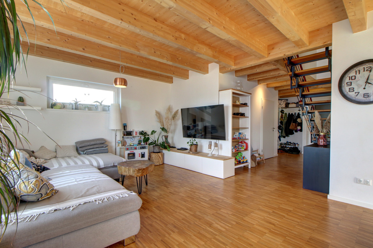 Im weitläufigen Wohnzimmer trifft sich die Familie zum Lesen, Spielen oder um den nächsten Wochenendausflug zu planen. Die offene Wohnküche glänzt durch hochmoderne Einbauten: Hier gewinnen Sie jedes Kochduell im Freundeskreis und beim Empfang von Gästen oder dem gemeinsamen Kochen bleibt niemand allein.