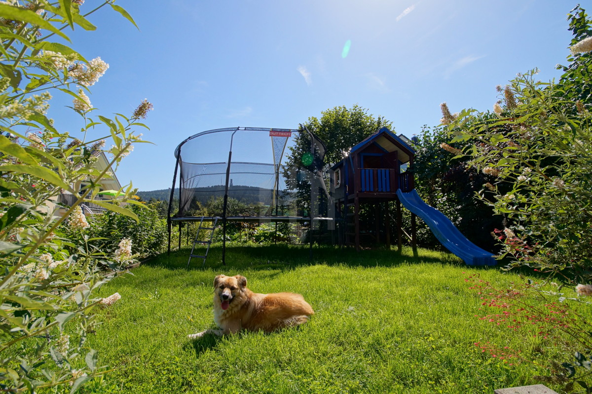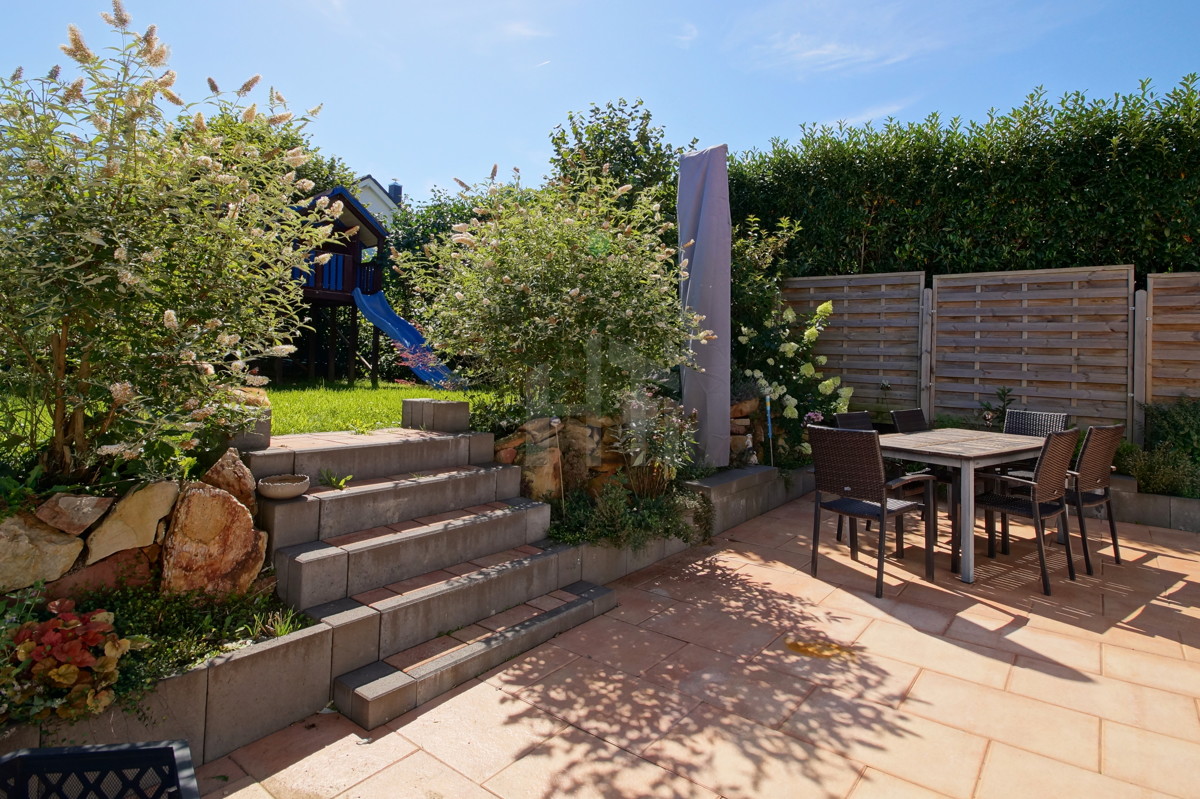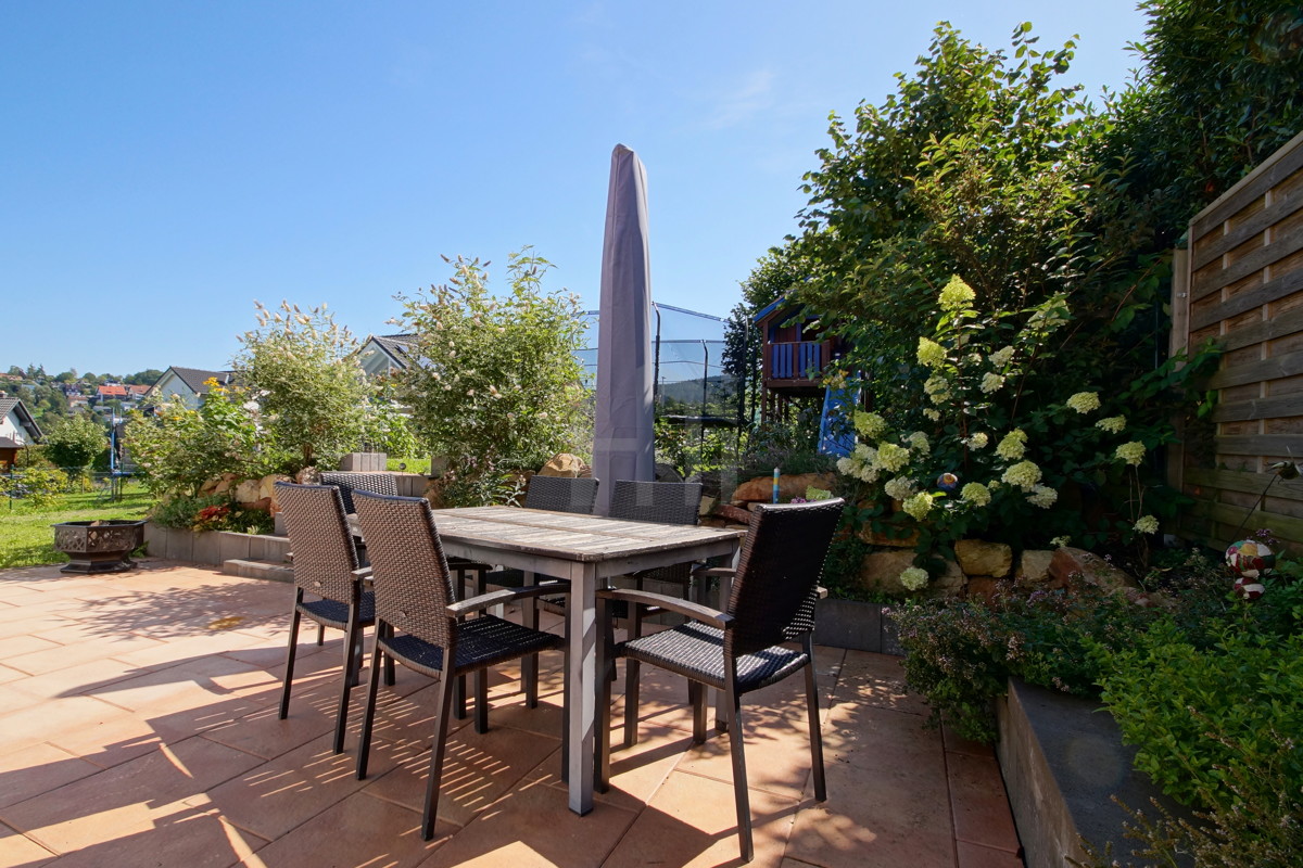 Der großzügige süd-west-ausgerichtete Terrassenbereich geht in den liebevoll gestalteten Garten über. Hier bieten schattenspendende Bäume beste Gelegenheit für entspannte Feierabende oder die Grillfeier mit Freunden und Familie am Wochenende. Auch Schaukel, Sandkasten und Trampolin finden hier ihren Platz.