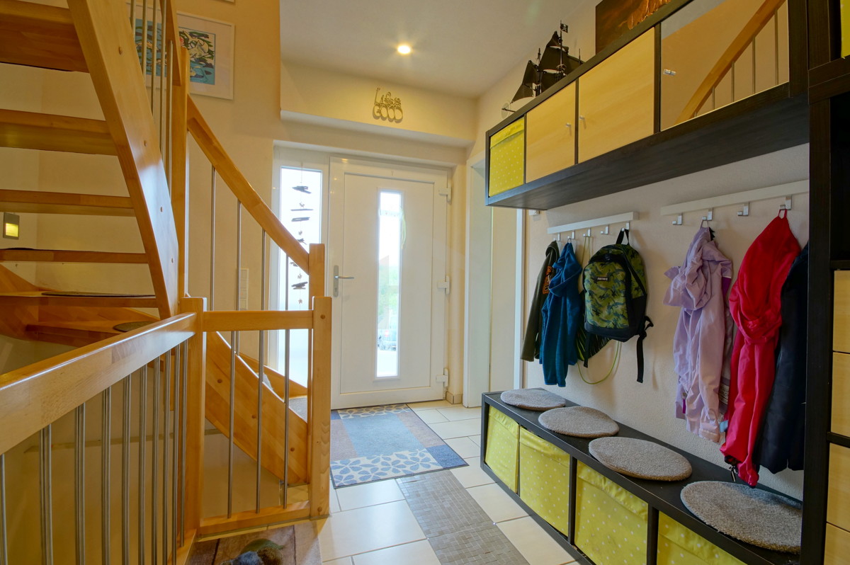 Die praktische Raumaufteilung des Hauses mit drei Schlafzimmern sowie zwei vollwertigen Badezimmern bietet jedem Familienmitglied ausreichend Platz und Entfaltungsmöglichkeiten. Das lichtdurchflutete Wohn-Esszimmer mit offener Küche und Zugang zur Frühstücksterrasse bilden den Wohnmittelpunkt des Hauses. Hier wird gemeinsam gegessen, gelesen, diskutiert, gespielt oder der nächste Wochenendausflug geplant. Ein Kaminofen sorgt für wohlige Wärme und niedrige Heizkosten, auch an kühleren Tagen.