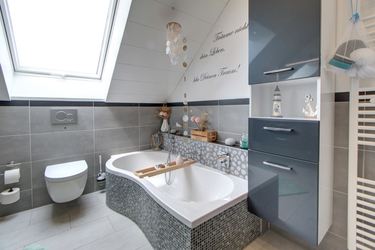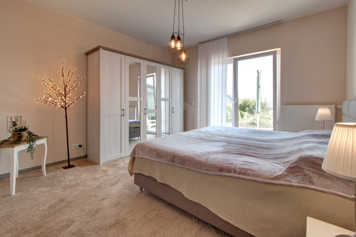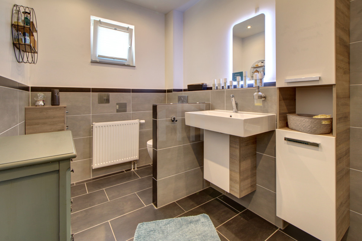Tageslichtbad als eigenständiger Bereich für die Kinder, im ansprechenden Schlafzimmer im Erdgeschoß mit eigenem Duschbad und vielen Stellmöglichkeiten sind die Eltern ganz für sich.