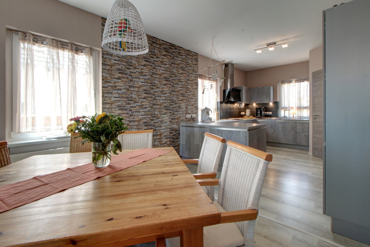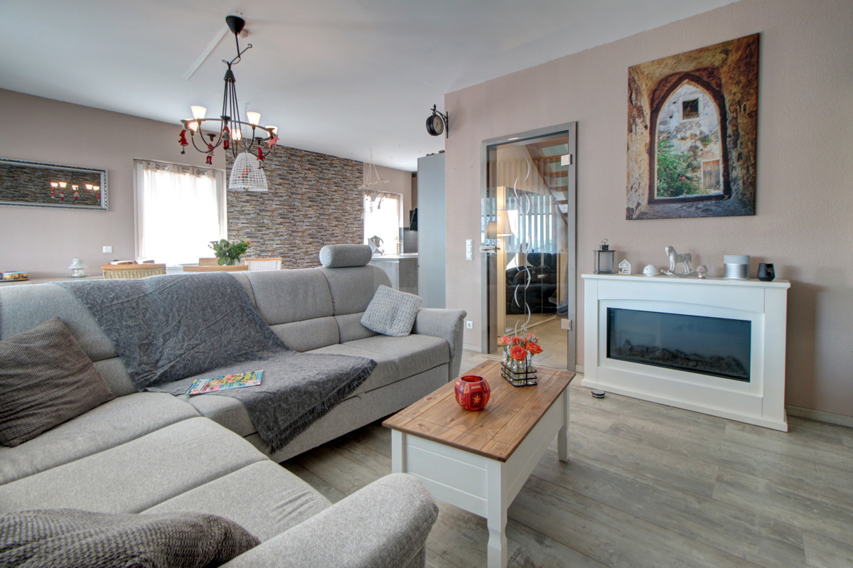 Im weitläufigen Wohnzimmer trifft sich die Familie zum Lesen, Spielen oder um den nächsten Wochenendausflug zu planen. Die angrenzende Küche - zum Wohnzimmer hin offen – glänzt durch eine hochmoderne