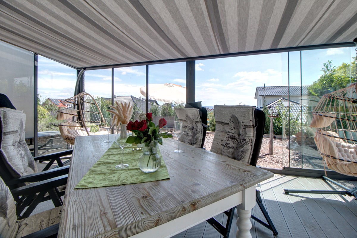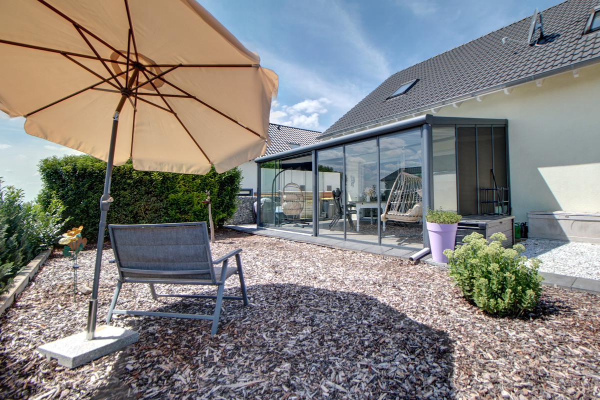 Der Garten erstreckt sich über zwei Ebenen und lädt Kinder zum Spielen ein, während die große Terrasse mit dem vielseitigen Wintergarten zu jeder Jahreszeit beste Gelegenheit für den entspannten Feierabend oder die Grillfeier mit Freunden am Wochenende bietet.