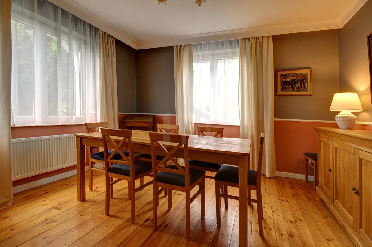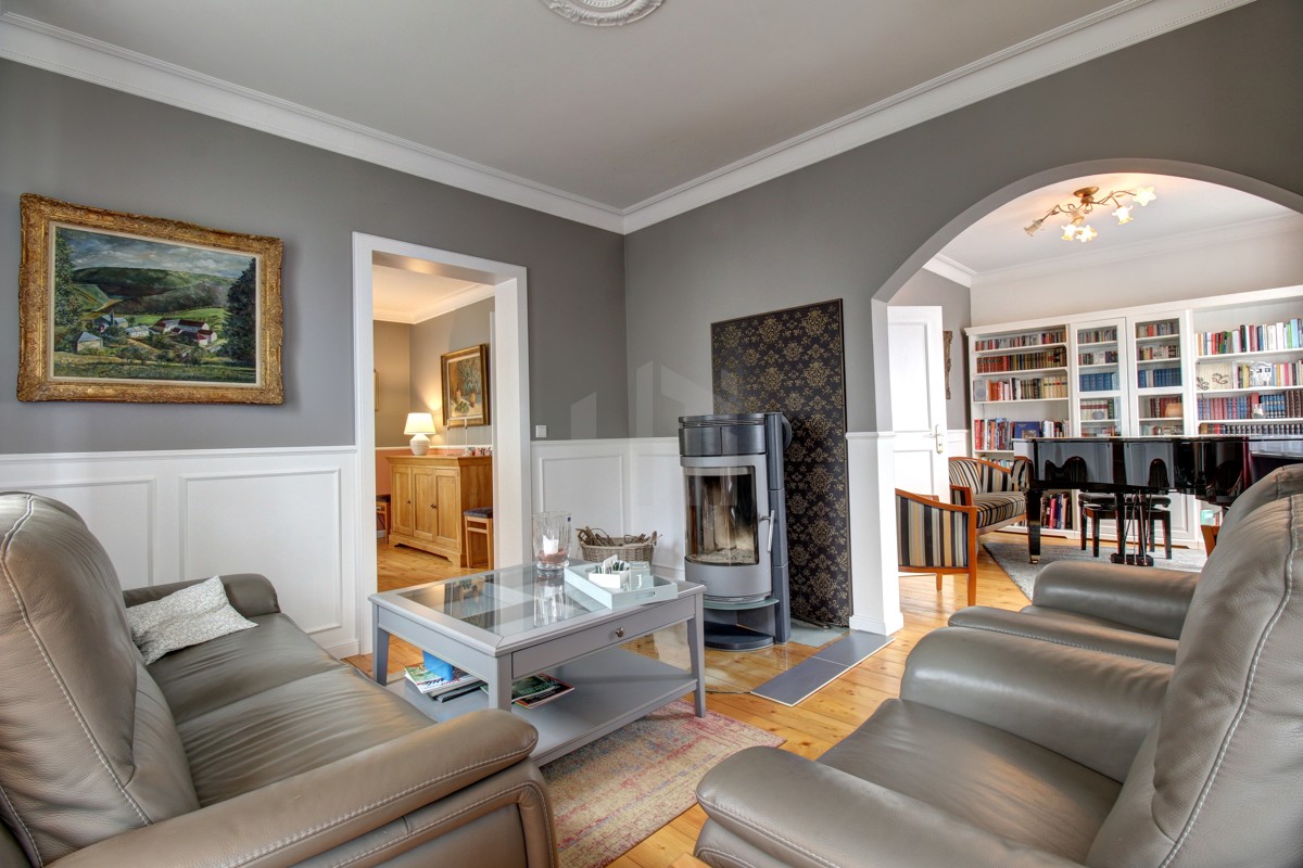 Im Erdgeschoss finden Sie die großzügige Einbauküche, ausgestattet mit Siemens-Elektrogeräten und einem separaten Raum, der Platz bietet für zwei große Kühlschränke. Das anschließende Esszimmer und das gemütliche Wohnzimmer mit Kaminofen bilden den Wohnmittelpunkt des Hauses. Hier werden Sie sich gerne mit Ihrer Familie oder mit Freunden aufhalten.