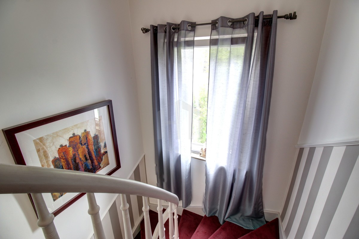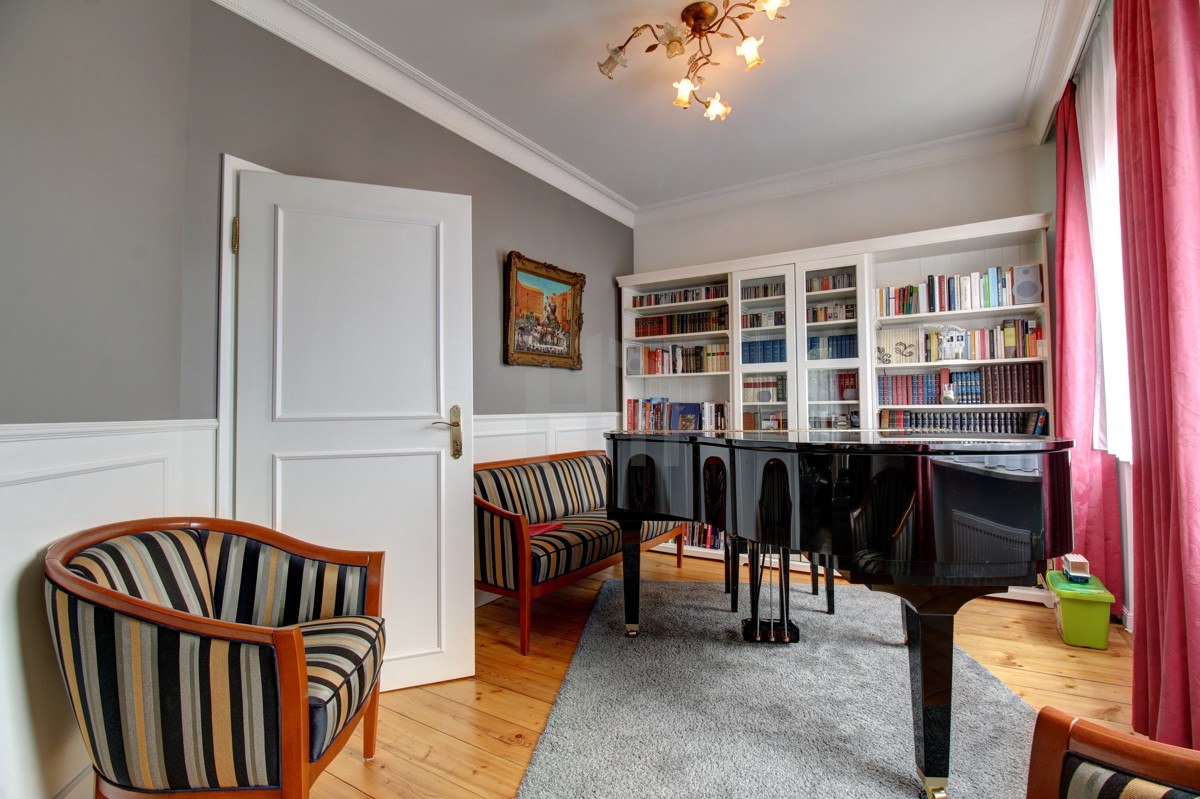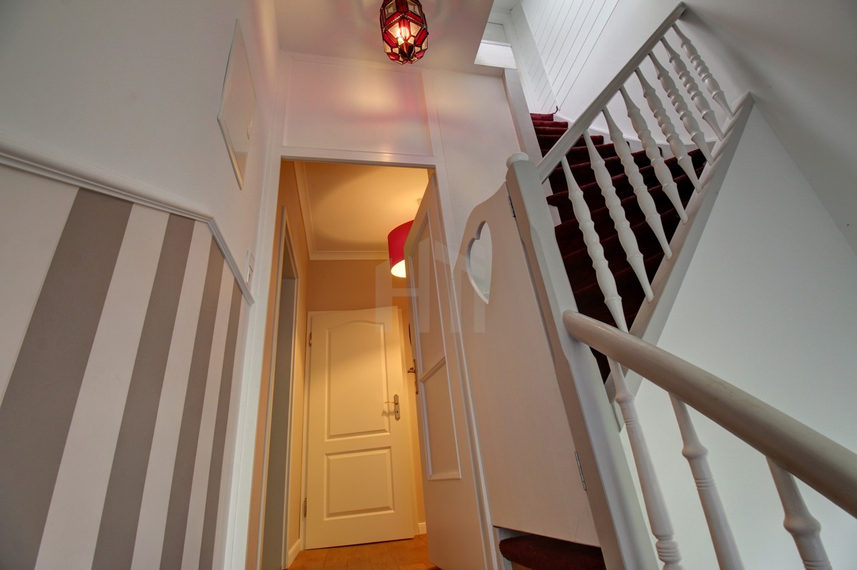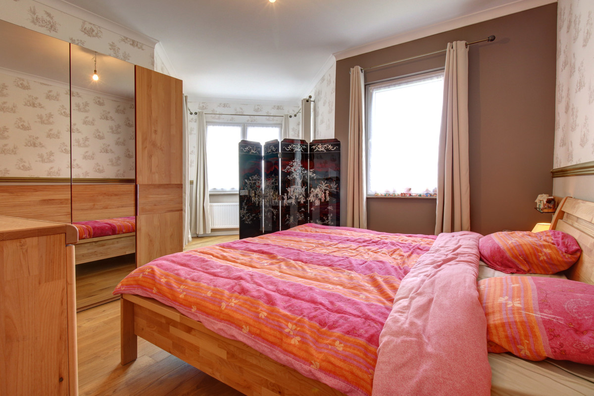 Im Obergeschoss befinden sich drei Schlafzimmer sowie das geräumige Badezimmer mit Wanne und einer integrierten Sauna. Ein kleines ausgebautes Dachstudiozimmer bietet einen weiteren Rückzugsort beispielsweise zum Lesen oder Musikhören.