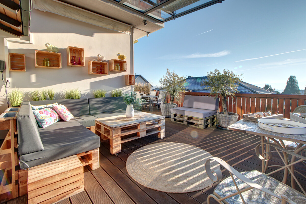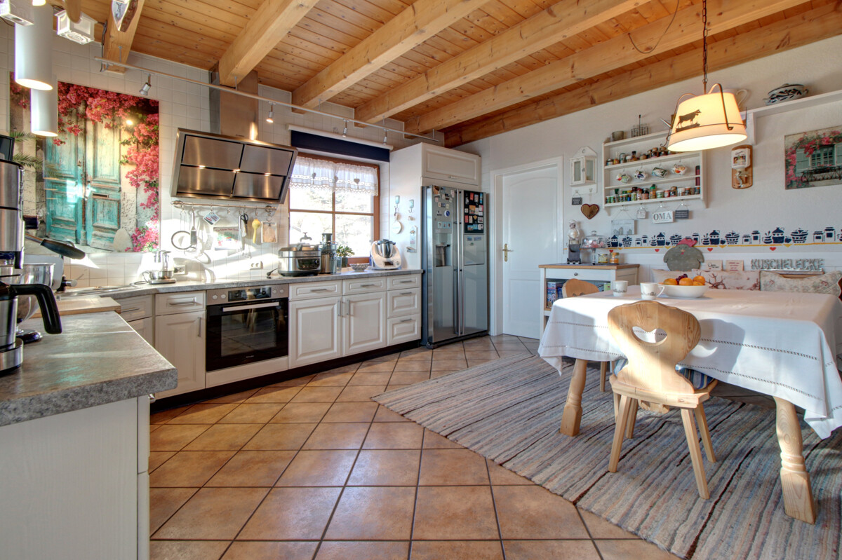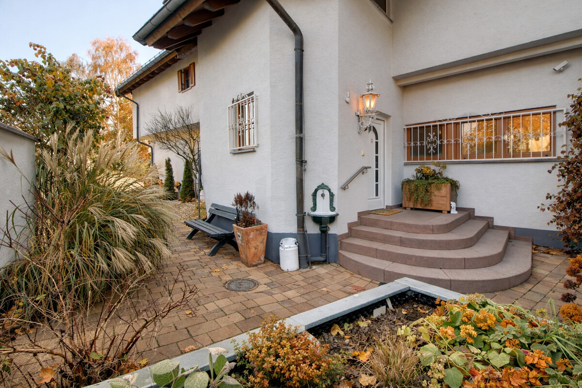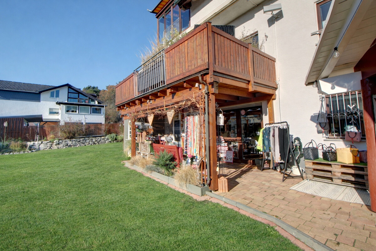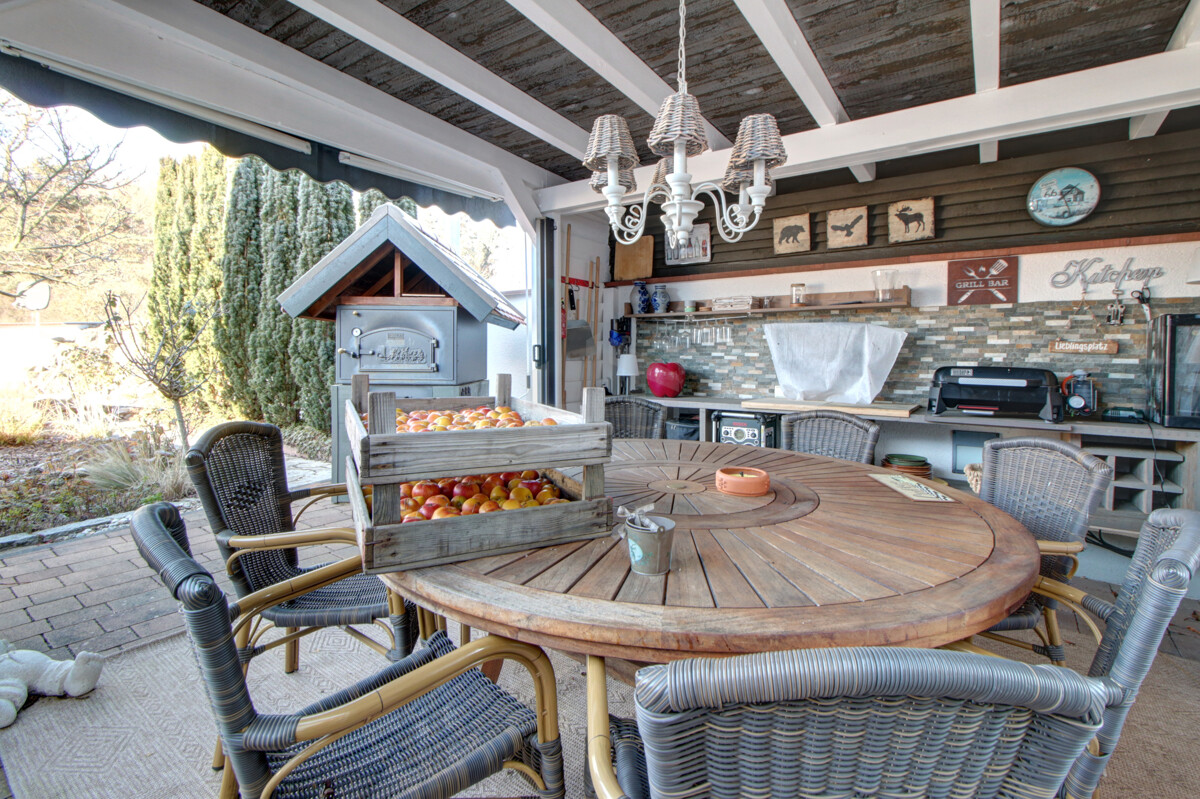 Der Außenbereich bietet mit Rasenflächen, überdachtem Freisitz und sonniger Terrasse ein hohes Maß an Privatsphäre. Die angrenzenden Felder und die Nähe zu den Eschbacher Klippen unterstreichen die naturnahe Lage.