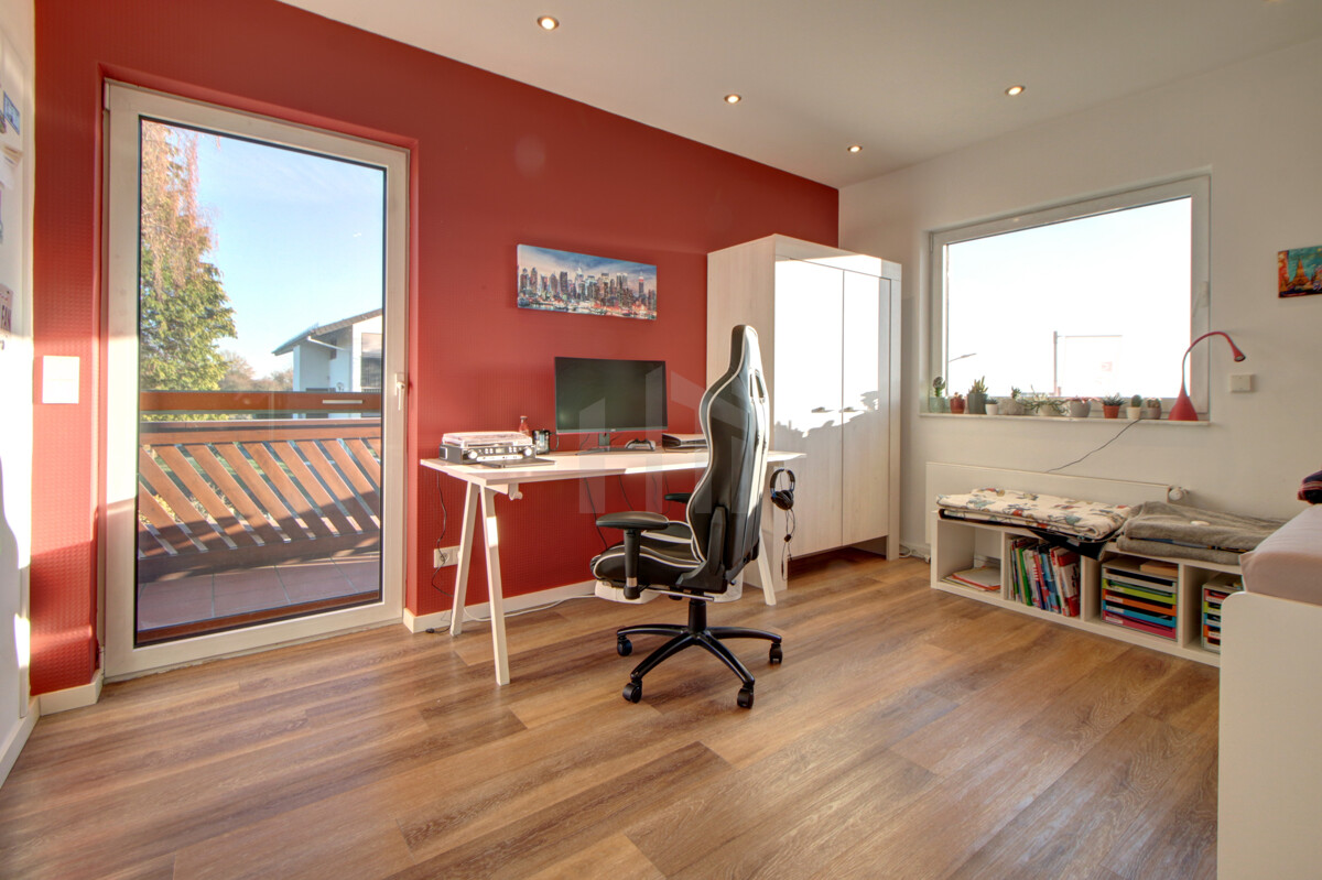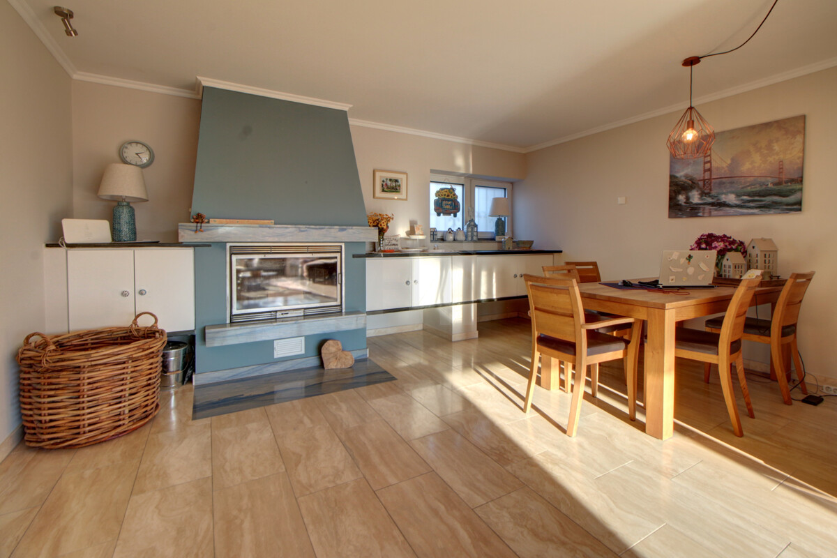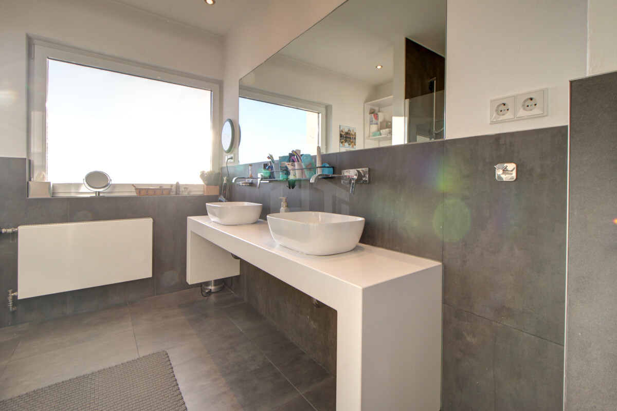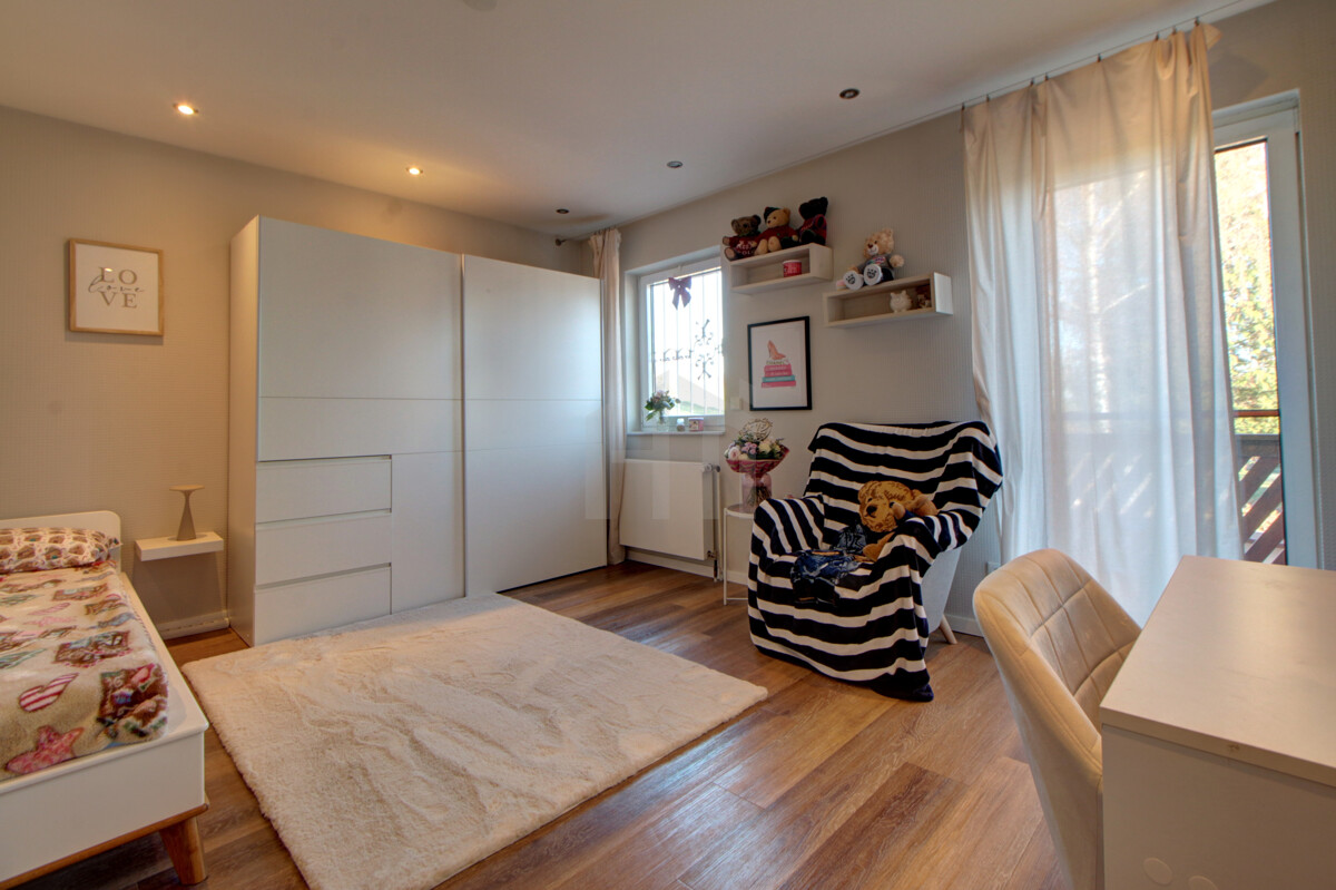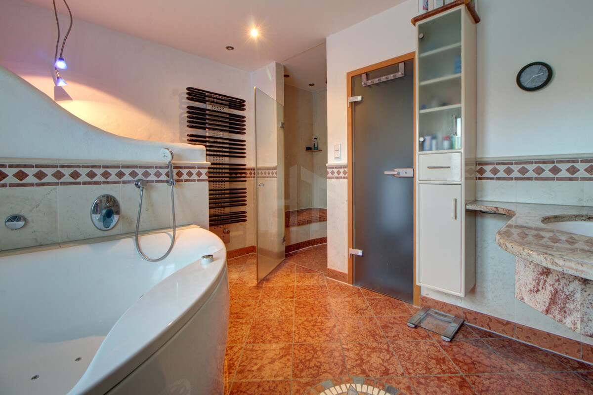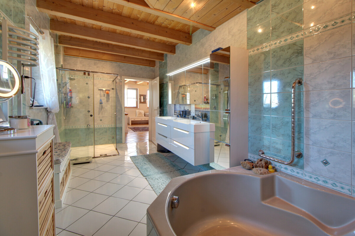 Im Erdgeschoss befindet sich eine abgeschlossene Wohneinheit mit großzügigem Wohnzimmer, Kaminecke und imposanten Sonnenbalkonen. Die separate, hochwertig ausgestattete Küche bietet Raum für gemeinsames Kochen. Fünf Schlafzimmer ermöglichen flexible Nutzung – für Familie, Gäste oder Homeoffice. Zwei Bäder, darunter ein Wellnessbad mit Whirlpoolwanne und Dampfdusche, sorgen für zusätzlichen Komfort.