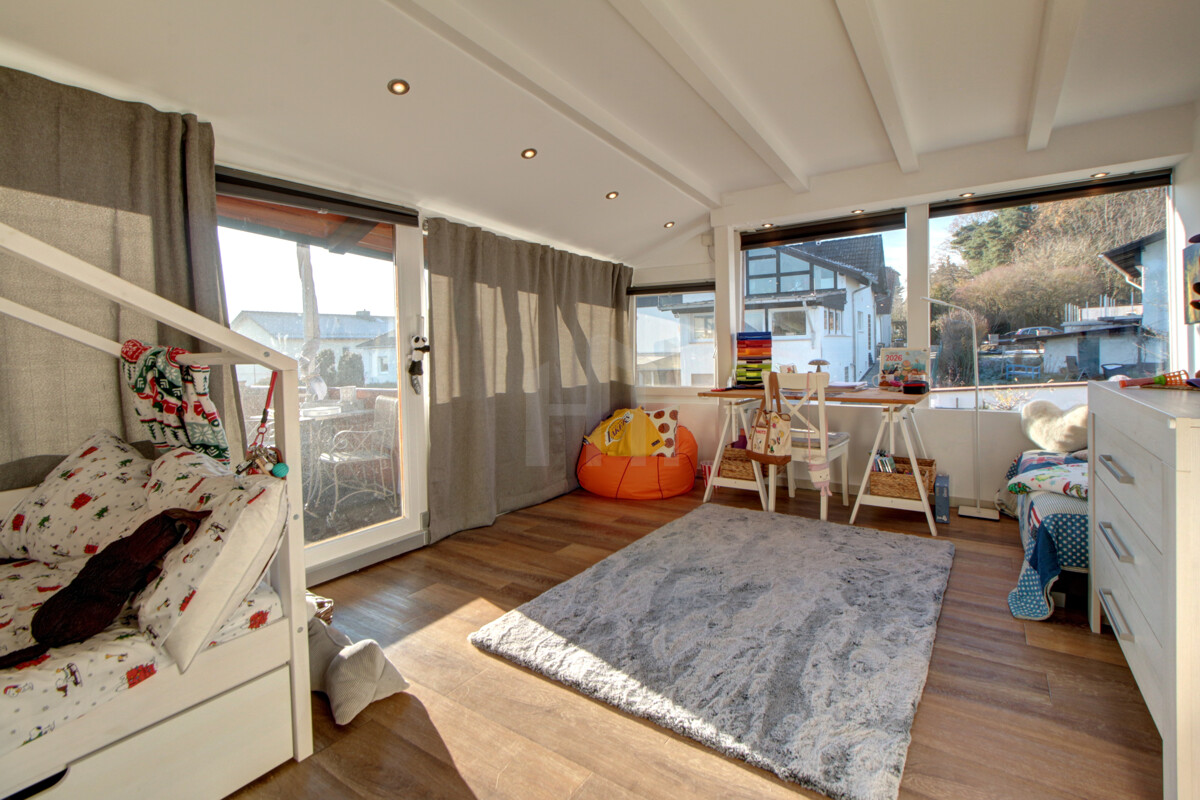 Im Gartengeschoss stehen zusätzlich ca. 60 m² wohnlich ausgebaute Flächen zur Verfügung. Ursprünglich als Schwimmhalle und Kellerräume genehmigt, zählen sie nicht zur offiziellen Wohnfläche, erweitern jedoch als Gäste-, Hobby- oder Arbeitsbereich die Nutzungsmöglichkeiten erheblich.