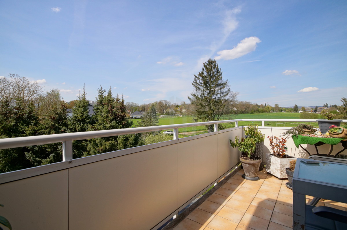 Auf dem Süd-West ausgerichteten Balkon genießen Sie einen herrlichem Blick ins Grüne und über das weite Feld.