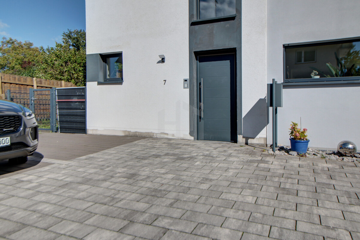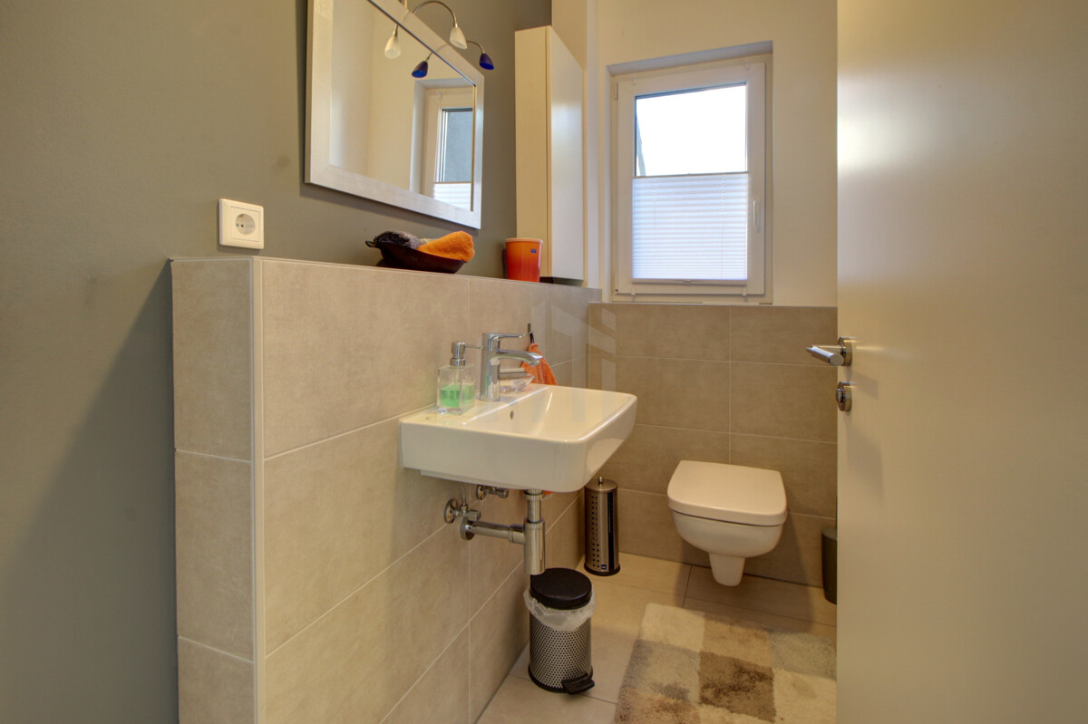 Drei komfortable Schlafzimmer bieten ausreichend Platz für die ganze Familie oder Home-Office-Lösungen. Ein zusätzliches Gäste-Bad mit Dusche vervollständigt den durchdachten Grundriss. Für Ihren Komfort sind sowohl ein geräumiger Kellerabstellraum als auch ein großzügiger KFZ-Stellplatz vorhanden.